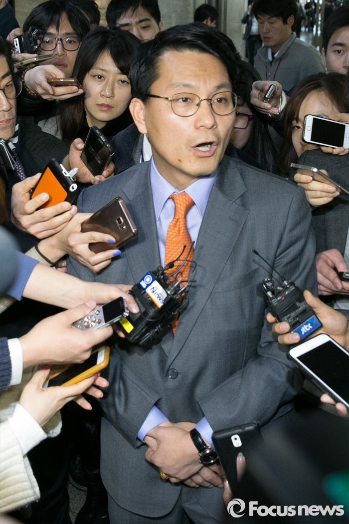 (서울=포커스뉴스) 김무성 새누리당 대표를 향한 욕설로 당내 파문을 일으킨 윤상현 의원이 9일 오전 서울 여의도 새누리당 대표최고위원실 앞 로비에서 기자들의 질문에 답변하고 있다. 전날 윤 의원은 전화를 통해 김 대표를 거론하며 욕설한 사실이 언론에 공개됐으며, 이날 김 대표에게 면담을 요청했으나 거절됐다.