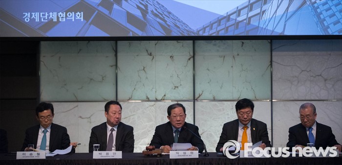 (서울=포커스뉴스) 9일 오전 서울 중구 플라자호텔에서 열린 '2016 경제단체협의회 정기총회'에 참석한 박병원(왼쪽 세번째) 한국경영자총협회장이 발언을 하고 있다.