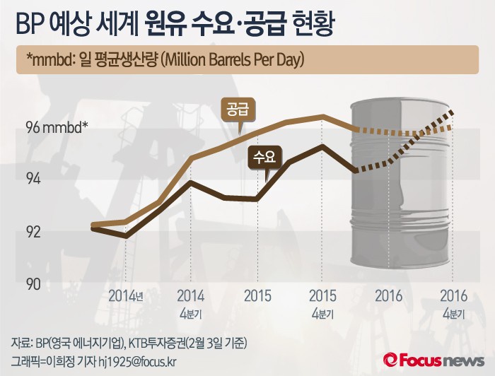 (서울=포커스뉴스) 영국 에너지기업 BP가 예상한 바에 따르면 2016 하반기부터 세계 원유 생산량 감소로 수요와 공급의 격차가 줄어들어 원유값이 안정될 것으로 예상된다.