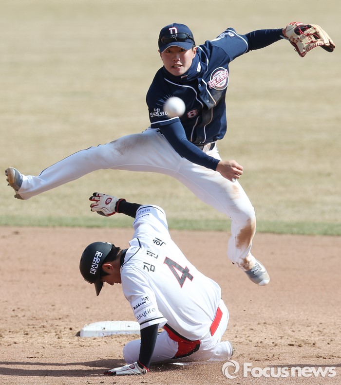 (수원=포커스뉴스) 9일 수원 kt위즈파크에서 열린 2016 KBO리그 시범경기 두산-kt 경기에서 5회 무사 1,2루에서 kt 하준호의 2루 땅볼때 두산 유격수 류지혁이 1루주자 김민혁을 2루에서 포스아웃 시킨후 1루로 송구해 병살을 성공시키고 있다.