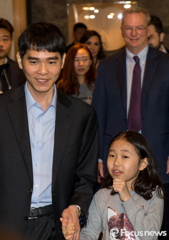 이날부터 15일까지 총 다섯 차례에 걸쳐 열리는 이세돌 9단과 알파고의 대국은 모두 구글의 동영상 사이트 유튜브 채널에서 생중계된다.(서울=포커스뉴스) 9일 오후 서울 종로구 포시즌스 호텔에서 열린 '구글 딥마인드 챌린지 매치'에서 이세돌 9단이 딸 혜림양과 함께 대국장으로 향하고 있다. 뒤는 부인 김현진씨와 에릭 슈미트 구글 회장. 2016.03.09 양지웅 기자