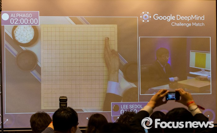 (서울=포커스뉴스) 9일 오후 서울 종로구 포시즌스 호텔에서 열린 이세돌 9단과 알파고의 '구글 딥마인드 챌린지 매치'에 참석한 취재진이 대형화면에 나타난 이세돌 9단의 착수를 관전하고 있다.
