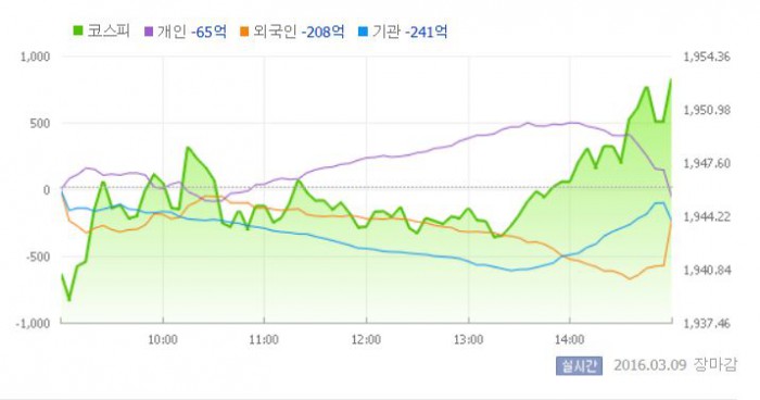 이날 코스피는 1940선에서 하락세로 출발했다. 지수는 장중 국제유가와 뉴욕증시 하락의 영향으로 약세를 면치 못했다. 그러나 장 후반 프로그램 순매수 규모가 커지면서 반등해 다시 1950선으로 올라섰다.