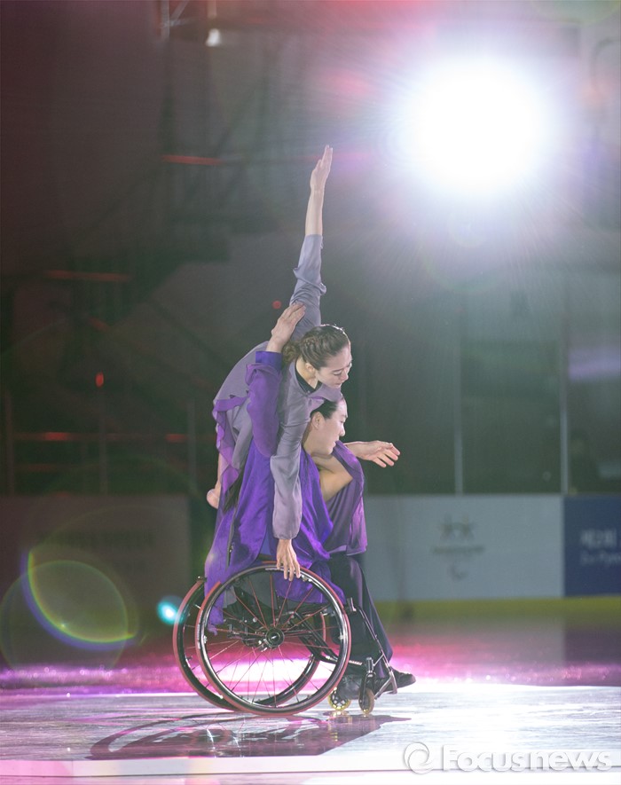 (춘천=포커스뉴스) 9일 오후 강원 춘천의암빙상장에서 휠체어 무용가 김용우와 이소민(현대무용) 부부가 제2회 2018 평창 패럴림픽 데이를 축하하는 무대를 선보이고 있다.