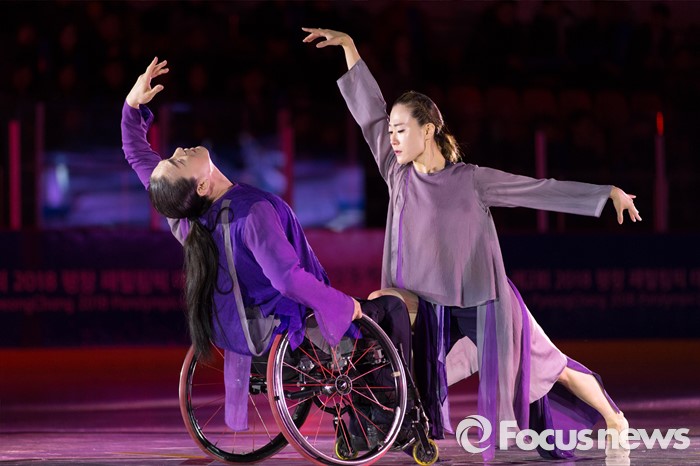 (춘천=포커스뉴스) 9일 오후 강원 춘천의암빙상장에서 휠체어 무용가 김용우와 이소민(현대무용) 부부가 제2회 2018 평창 패럴림픽 데이를 축하하는 무대를 선보이고 있다.