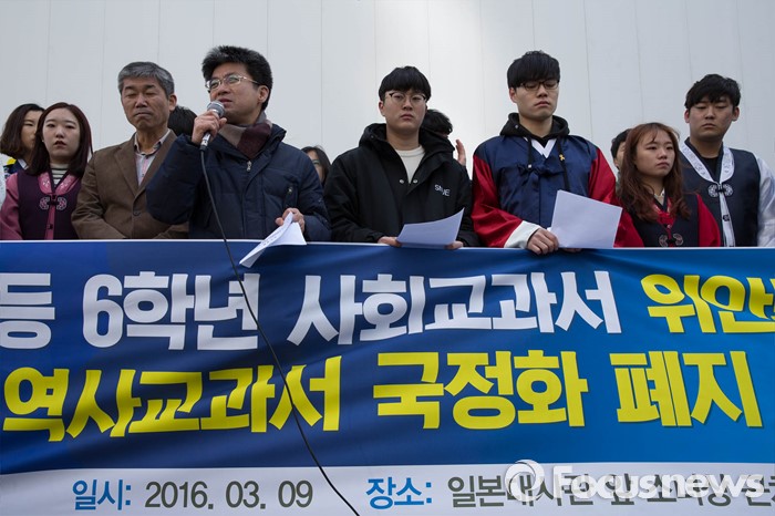 (서울=포커스뉴스) 9일 오후 서울 종로구 옛 일본대사관 앞에서 '초등학교 사회교과서 위안부 표현 삭제 규탄 기자회견'에 참가한 전국교육대학생연합 회원들이 역사교과서 국정화 폐지를 촉구하고 있다.