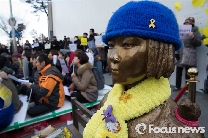 (서울=포커스뉴스) 9일 오후 서울 종로구 옛 일본대사관 앞에서 열린 '일본군 위안부 문제해결을 위한 1221차 정기 수요집회'에서 참가자들이 일본정부의 공식 사과를 촉구하고 있다.