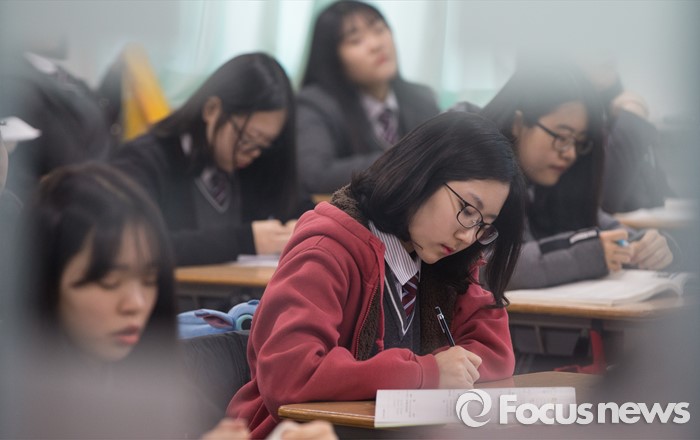(서울=포커스뉴스) 10일 오전 서울 서대문구 명지고등학교에서 1학년 학생들이 2016학년도 첫 전국연합학력평가를 앞두고 마지막 공부를 하고 있다.
