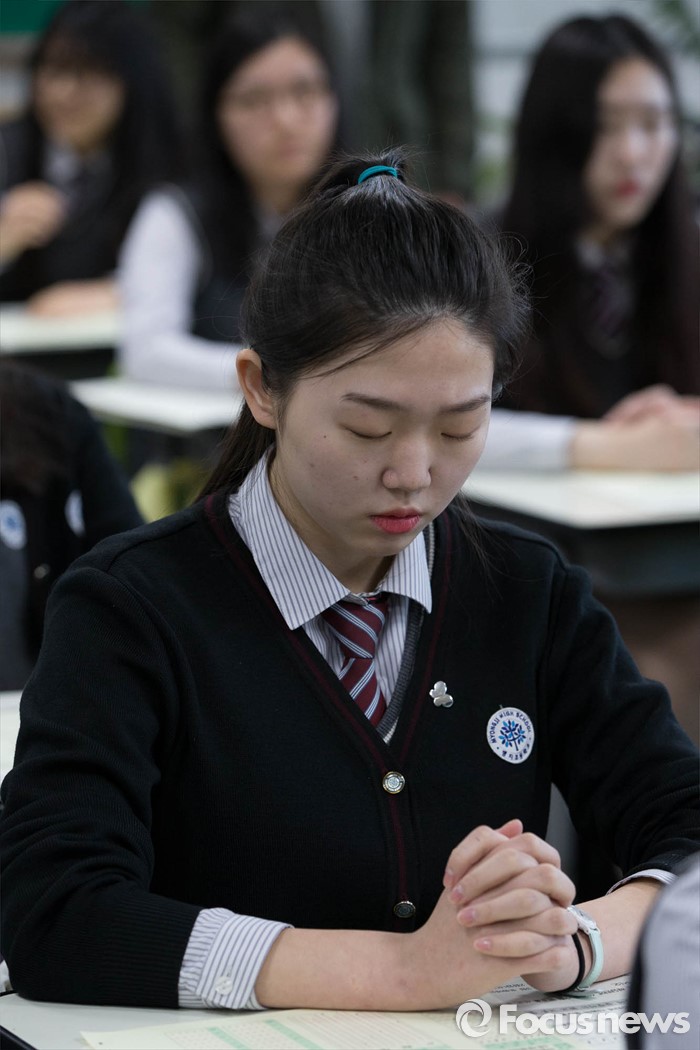 (서울=포커스뉴스) 올해 첫 전국학력평가가 실시된 10일 오전 서울 서대문구 명지고등학교에서 한 3학년 학생이 시험을 앞두고 기도하고 있다.