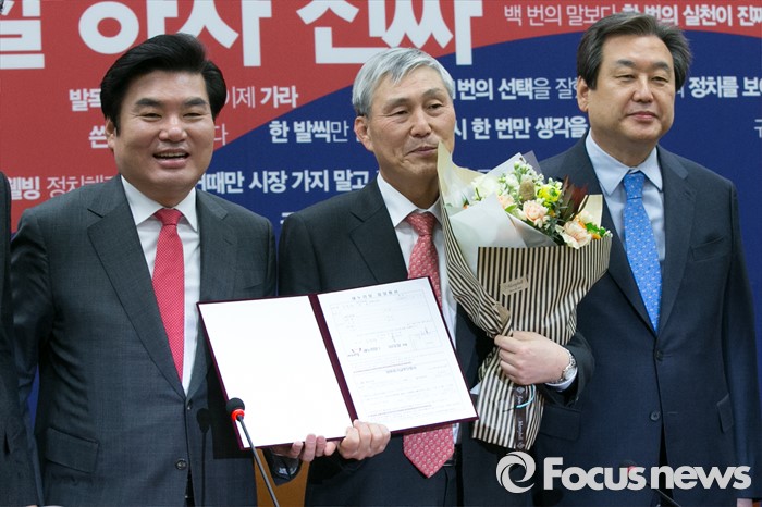 (서울=포커스뉴스) 프로바둑 조훈현(가운데) 9단이 10일 오전 서울 여의도 국회 새누리당 대표최고위원실에서 열린 입당식에 참석해 김무성(오른쪽) 대표, 원유철 원내대표와 기념사진을 찍고 있다.