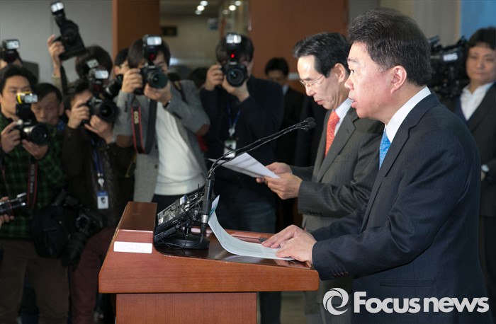 (서울=포커스뉴스) 홍창선(왼쪽) 더불어민주당 공천관리위원장과 김성수 대변인이 10일 오전 서울 여의도 국회 정론관에서 20대 총선 경선 및 단수지역과 2차 공천배제(컷오프) 명단 발표를 하고 있다.