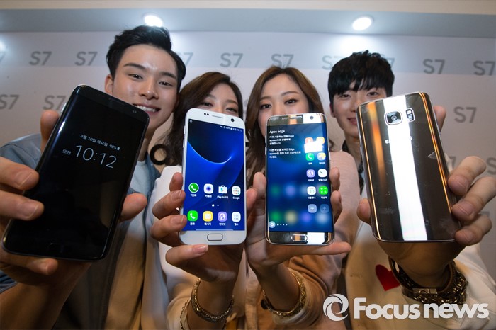 (서울=포커스뉴스) 10일 오전 서울 중구 신라호텔에서 삼성전자의 스마트폰 '갤럭시 S7 엣지와 갤럭시 S7'을 모델들이 선보이고 있다. 이번 제품은 듀얼 픽셀과 F1.7 조리개 탑재, 방수·방진과 대용량 배터리가 탑재되어 있다.