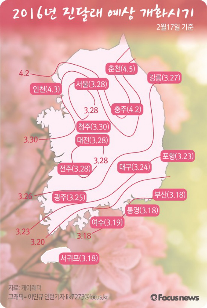민간기상업체 케이웨더에 따르면 진달래는 제주도 서귀포에서 가장 먼저 꽃망울을 터뜨린다. 남부지방은 18일과 19일, 중부지방은 28일 이후 활짝웃는 진달래를 만날 수 있다. 서울에서는 28일쯤 진달래 개화가 절정을 이룰 것으로 전망된다.