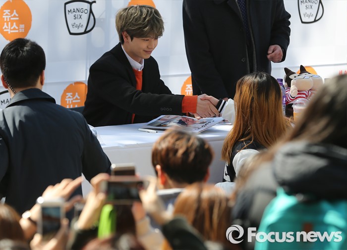 (서울=포커스뉴스) 10일 오후 서울 서대문구 이화여자대학교에서 열린 '캠퍼스 어택' 행사에 참석한 가수 육성재가 한 팬에게 사인을 해주고 있다.