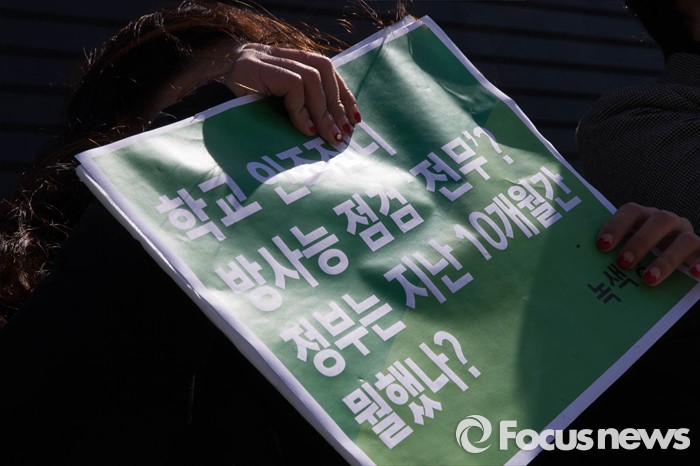 (서울=포커스뉴스) 녹색당 탈핵선거운동본부원들이 10일 오전 서울 종로구 광화문 KT사옥 앞에서 학교 인조잔디의 방사능점검을 촉구하고 있다.