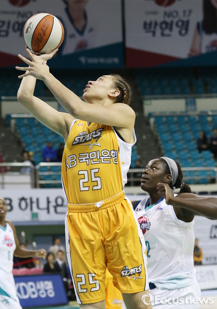 햄비의 활약 속에 KB스타즈는 7라운드 5경기 전승을 거두며 정규시즌 3위(19승16패)를 기록, 플레이오프에 진출했다.<서울=포커스뉴스> 여자프로농구 KB스타즈 외국인선수 햄비가 7라운드 최우수선수(MVP)로 선정됐다. 사진은 햄비가 지난해 11월27일 부천체육관에서 열린 KEB하나은행와의 경기에서 슛을 쏘는 모습. 우정식 기자