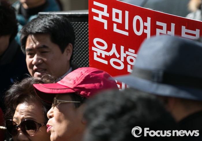 (서울=포커스뉴스) 10일 오후 서울 여의도 새누리당사 앞에서 부산에서 상경한 김무성 대표 지지자들이 윤상현 의원 징계 등을 촉구하는 집회를 하고 있다.