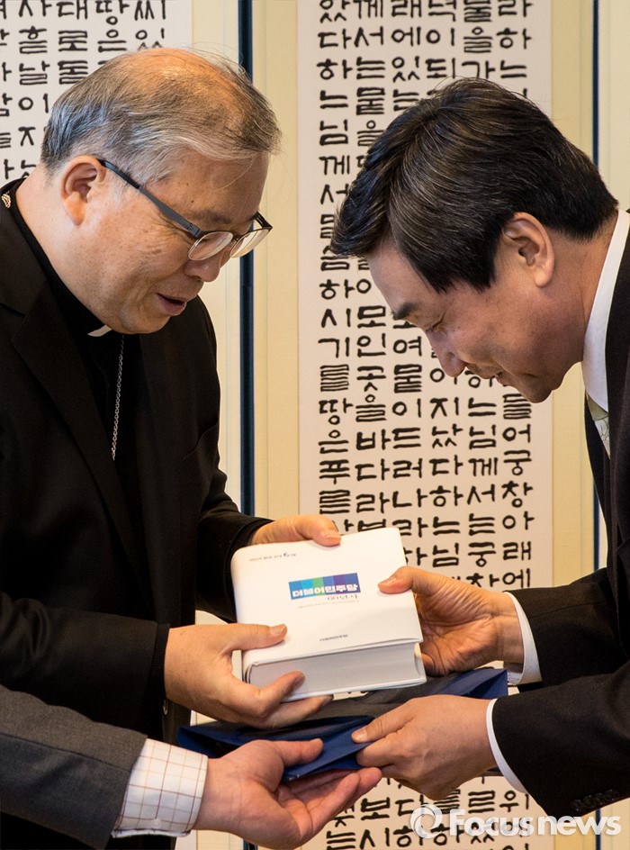 (서울=포커스뉴스) 10일 오후 서울 중구 명동성당에서 장발장법 통과에 대한 감사패를받은이종걸(오른쪽) 더불어민주당 원내대표가 염수정 추기경에게 더민주 60년사 책자를 전달하고 있다.