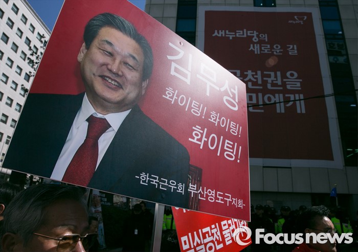 (서울=포커스뉴스) 10일 오후 서울 여의도 새누리당사 앞에서 부산에서 상경한 김무성 대표 지지자들이 윤상현 의원 징계 등을 촉구하는 집회를 하고 있다.