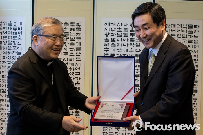 (서울=포커스뉴스) 10일 오후 서울 중구 명동성당에서 이종걸(오른쪽) 더불어민주당 원내대표가 염수정 추기경으로부터 장발장법 통과에 대한 감사패를 전달받고 있다.