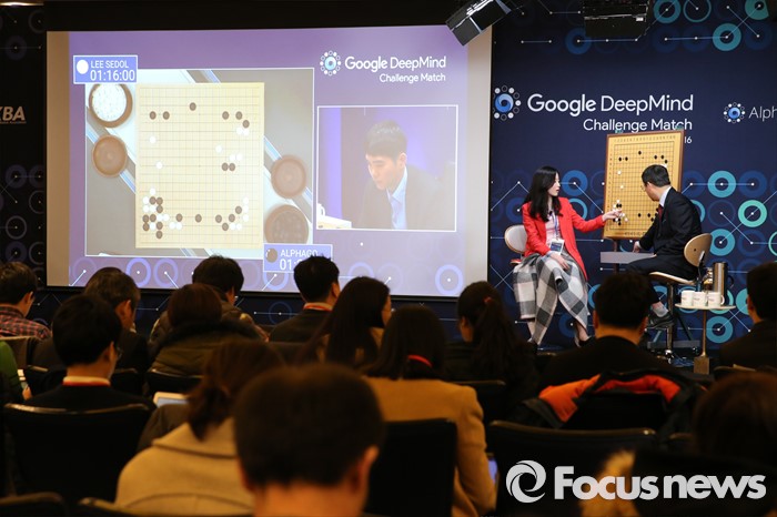 (서울=포커스뉴스) 10일 오후 서울 종로구 포시즌스호텔 기자실에서 유창혁(오른쪽) 프로9단 해설진이 이세돌 9단과 구글 인공지능 알파고의 '구글 딥마인드 챌린지 매치' 2차 대국을 해설하고 있다.