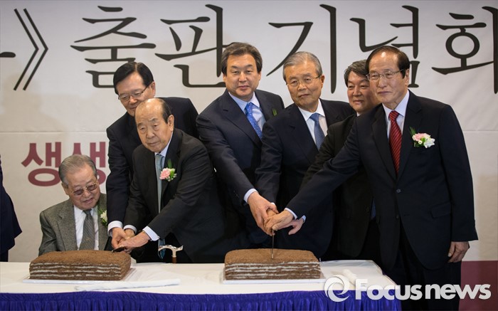 (서울=포커스뉴스) 10일 오후 서울 종로구 세종문화회관에서 열린 김종필 전 국무총리 출판기념회에서 국회의장 및 3당 대표들이 출판 기념 컷팅식을 하고 있다. 왼쪽부터 김종필 전 국무총리 정의화 국회의장, 김수한 전 국회의장, 김무성 새누리당 대표. 김종인 더불어민주당 비상대책위원회 대표, 안철수 국민의당 상임공동대표, 신경식 대한민국헌정회장.