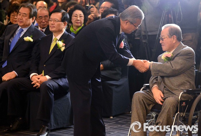 (서울=포커스뉴스) 김종인 더불어민주당 비대위 대표가 10일 오후 서울 종로구 세종문화회관 세종홀에서 열린 김종필 전 국무총리의 정치인생을 담은 '김종필 증언록' 출판기념회에 참석해 김 전 총리와 인사하고 있다. 왼쪽부터 김무성 새누리당 대표, 정의화 국회의장, 김 대표, 김 전 총리.