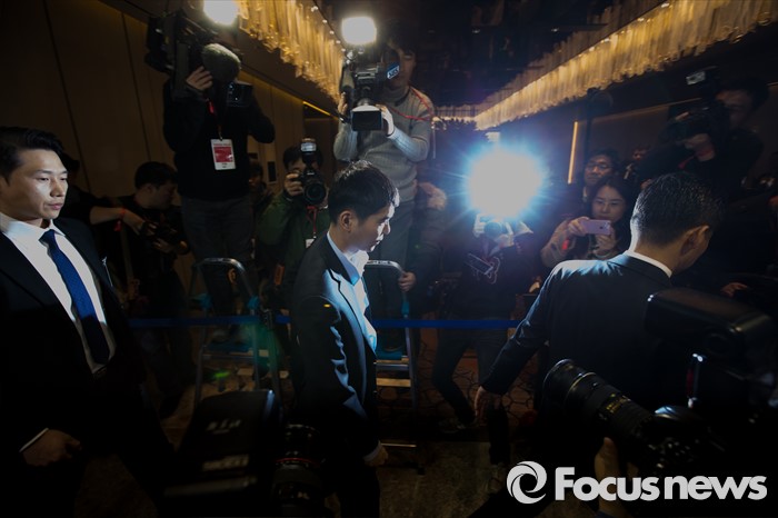 (서울=포커스뉴스) 프로바둑기사 이세돌 9단이 10일 오후 서울 종로구 포시즌스 호텔에서 열린 '구글딥마인드 챌린지 매치' 인공지능 '알파고'와의 제2국에 불계패를 당한 뒤 기자회견장으로 이동하고 있다.