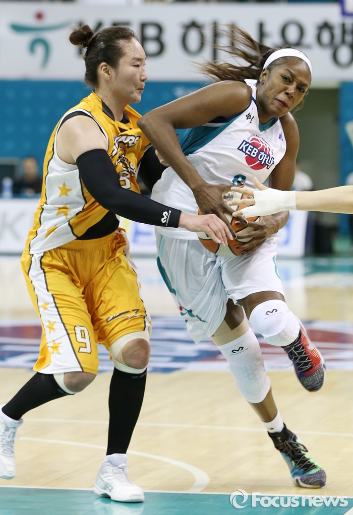 (부천=포커스뉴스) 10일 부천체육관에서 열린 2015-2016 여자프로농구 PO 1차전 KEB하나-KB스타즈 경기에서 KEB하나 버니스 모스비가 KB스타즈 정미란의 수비를 제치며 대시하고 있다.