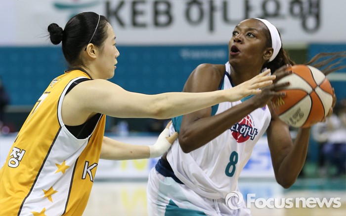 (부천=포커스뉴스) 10일 부천체육관에서 열린 2015-2016 여자프로농구 PO 1차전 KEB하나-KB스타즈 경기에서 KEB하나 버니스 모스비가 KB스타즈 강아정의 마크를 받으며 슈팅을 노리고 있다.