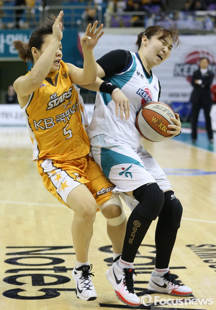 (부천=포커스뉴스) 10일 부천체육관에서 열린 2015-2016 여자프로농구 PO 1차전 KEB하나-KB스타즈 경기에서 KEB하나 백지은이 KB스타즈 심성영의 수비를 제치고 있다.