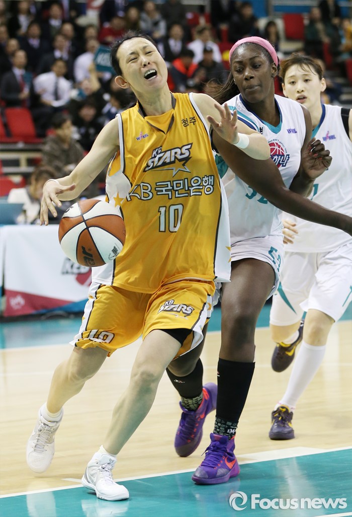 (부천=포커스뉴스) 10일 부천체육관에서 열린 2015-2016 여자프로농구 PO 1차전 KEB하나-KB스타즈 경기에서 KB스타즈 변연하가 KEB하나 첼시 리의 마크를 제치고 골밑으로 대시하고 있다.
