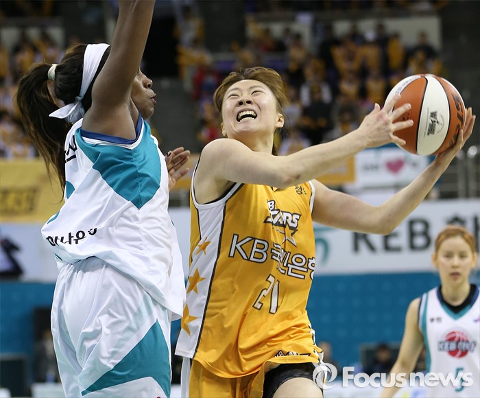 (부천=포커스뉴스) 10일 부천체육관에서 열린 2015-2016 여자프로농구 PO 1차전 KEB하나-KB스타즈 경기에서 KB스타즈 김진영이 KEB하나 모스비의 블록을 피해 레이업슛을 시도하고 있다.