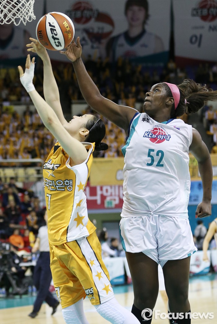 (부천=포커스뉴스) 10일 부천체육관에서 열린 2015-2016 여자프로농구 PO 1차전 KEB하나-KB스타즈 경기에서 KB스타즈 강아정의 레이업슛을 KEB하나 첼시 리가 블록으로 걷어내고 있다.