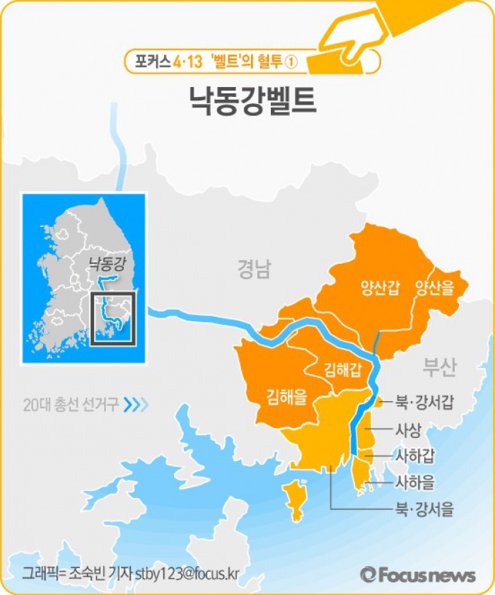 (서울=포커스뉴스) ‘낙동강 벨트’는 부산과 경남의 일부 지역구를 뜻하며 지역적으로 부산 북강서갑·을 선거구를 비롯해 사상, 사하갑·을과 경남의 김해갑·을, 양산 갑·을 지역 등을 의미한다.
