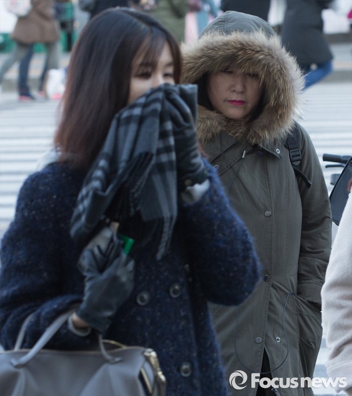 (서울=포커스뉴스) 사흘째 꽃샘추위가 이어지는 11일 오전 서울 2호선 구로디지털단지역 인근에서 시민들이 출근길을 재촉하고 있다.