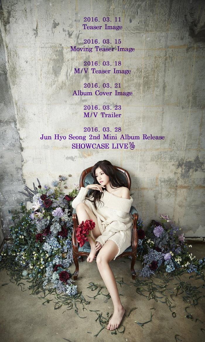 세부 일정과 함께 공개된 티저 이미지 속 전효성은 살짝 드러낸 어깨 라인과 각선미로 청초한 매력을 더하고 있다. 양 옆에 흐트러진 꽃들 사이에 앉아 한 곳을 응시하는 모습은 청순과 도발을 오가며 미묘한 분위기를 자아낸다.