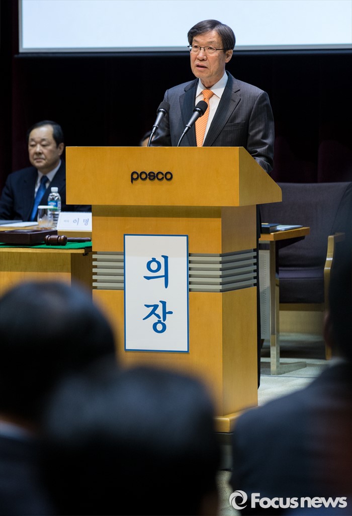 (서울=포커스뉴스) 11일 오전 서울 강남구 포스코센터에서 열린 정기주주총회에 참석한 권오준 포스코 회장이 인사말을 하고 있다.