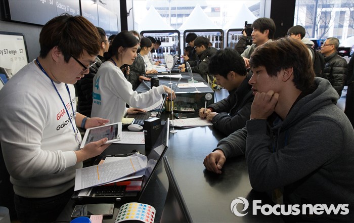 (서울=포커스뉴스) 갤럭시 S7 공식 출시일인 11일 오전 서울 종로구 광화문 KT스퀘어에서 구매자들이 개통전 상담을 받고 있다.