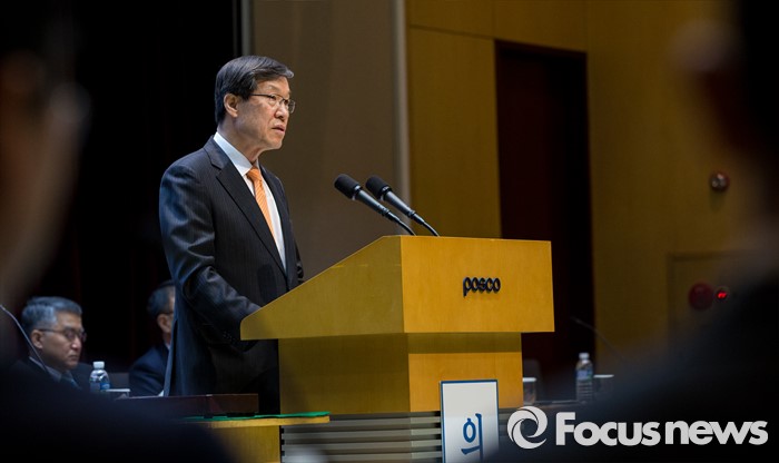 (서울=포커스뉴스) 11일 오전 서울 강남구 포스코센터에서 열린 정기주주총회에 참석한 권오준 포스코 회장이 인사말을 하고 있다.