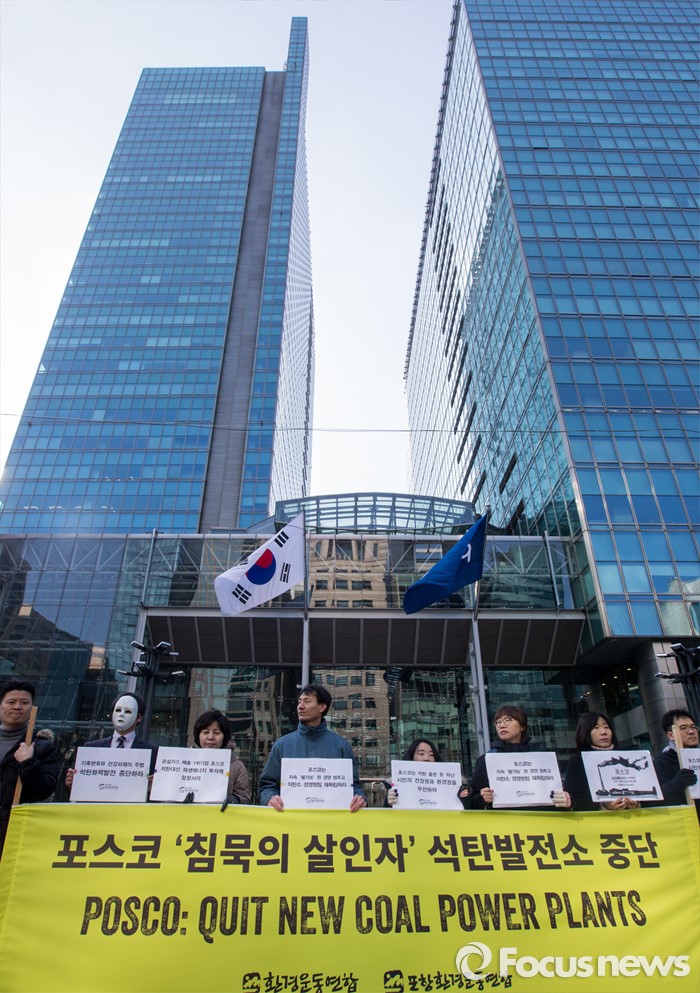 (서울=포커스뉴스) 11일 오전 서울 강남구 포스코센터 앞에서 환경운동연합 회원들이 포스코의 석탄화력발전소 추진을 규탄하는 기자회견을 갖고 있다.