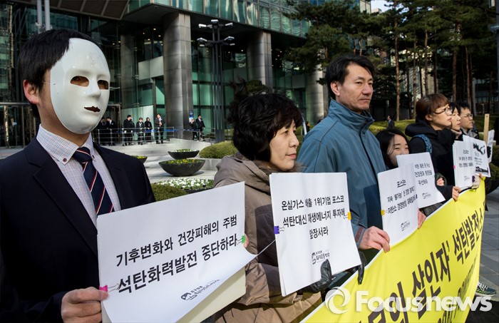 (서울=포커스뉴스) 11일 오전 서울 강남구 포스코센터 앞에서 환경운동연합 회원들이 포스코의 석탄화력발전소 추진을 규탄하는 기자회견을 갖고 있다.