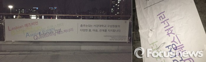 앞서 '춤추는 Q'와 서강대 총학생회 측은 지난달 29일 게시한 현수막이 훼손돼 이튿날 쓰레기통에 버려진 것을 발견했다.