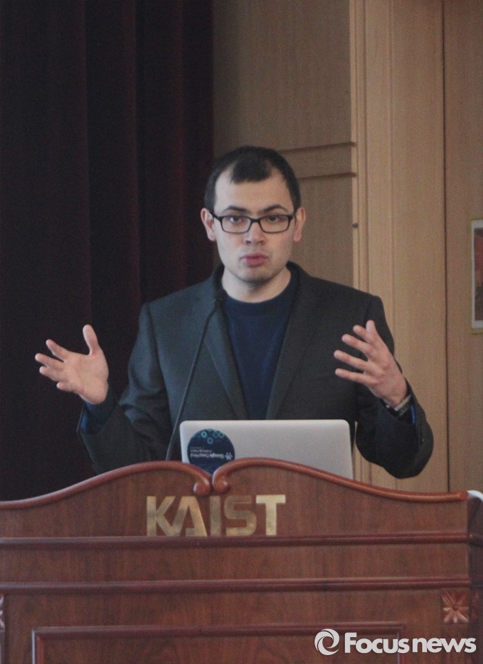 (대전=포커스뉴스) 이세돌 9단과 겨루는 인공지능 컴퓨터 알파고를 개발한 구글 딥마인드 최고경영자 데미스 하사비스가 11일 오후 대전 유성구 한국과학기술원에서 '인공지능과 미래' 라는 주제로 강연을 하고 있다.