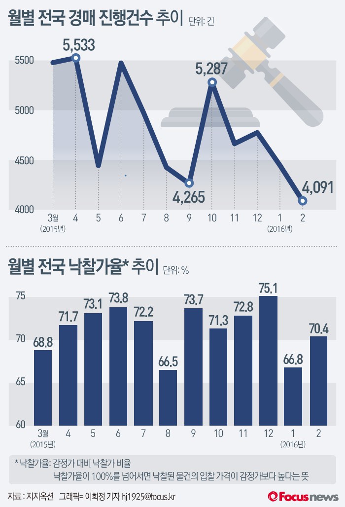 (서울=포커스뉴스) 11일 지지옥션에 따르면 2월 법원 경매 진행건수 1만 82건 중 낙찰건수는 4091건을 기록했다. 평균 낙찰가율은 2월 들어 일부 회복하면서 70.4%를 기록했다.