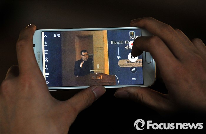 (대전=포커스뉴스)11일 오후 대전 유성구 한국과학기술원(KAIST)에서 한 학생이 '인공지능과 미래' 라는 주제로 강연하는 딥마인드 최고경영자 데미스 하사비스를 기념촬영하고 있다.