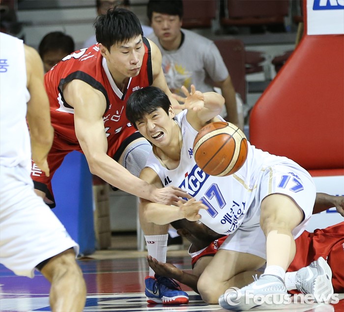 (안양=포커스뉴스) 11일 안양실내체육관에서 열린 2015-2016 프로농구 KGC-KCC 4강플레이오프 3차전에서 KCC 신명호가 바운드된 볼을 잡아 전태풍에게 패스하고 있다.