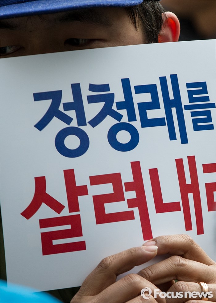 (서울=포커스뉴스) 12일 오전 서울 여의도 더민주 당사 앞에서 정청래 더불어민주당 의원 지지자들이 정 의원의 컷오프 철회를 요구하는 손팻말을 들고 있다. 이날 정 의원은 공직선거후보자 추천 재심위 재심신청서 접수를 마쳤다.