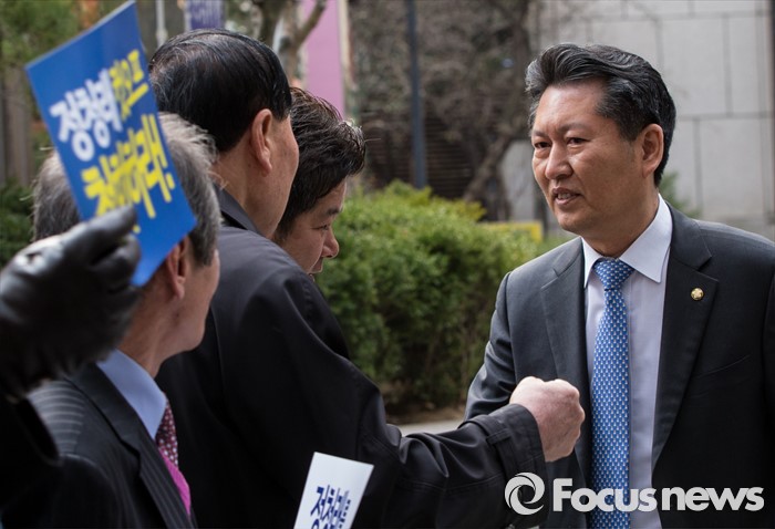 (서울=포커스뉴스) 20대 총선 공천 배제된 정청래 더불어민주당 의원이 12일 오전 공직선거후보자추천재심위원회에 재심신청서를 제출하기 위해 서울 여의도 더민주 당사를 향하며 지지자들과 인사하고 있다.