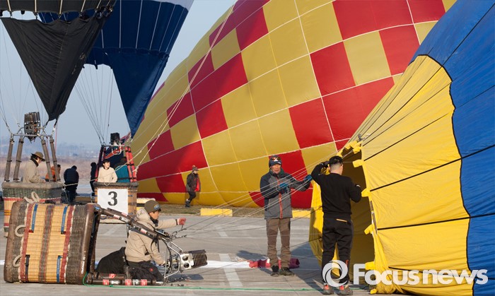 (논산=포커스뉴스) 12일 오전 충남 논산 강경읍 수변공원 일대에서 열린 2015-2016시즌 코리아열기구그랑프리 5차전 ‘오프로드컵’에서 대회에 출전한 선수들이 공중 레이스를 펼칠 준비를 하고 있다.
